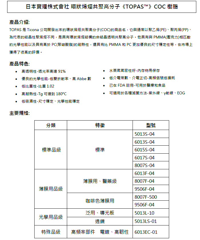 >> 日本宝理TOPAS环状烯烃共聚高分子COCac米兰app官网