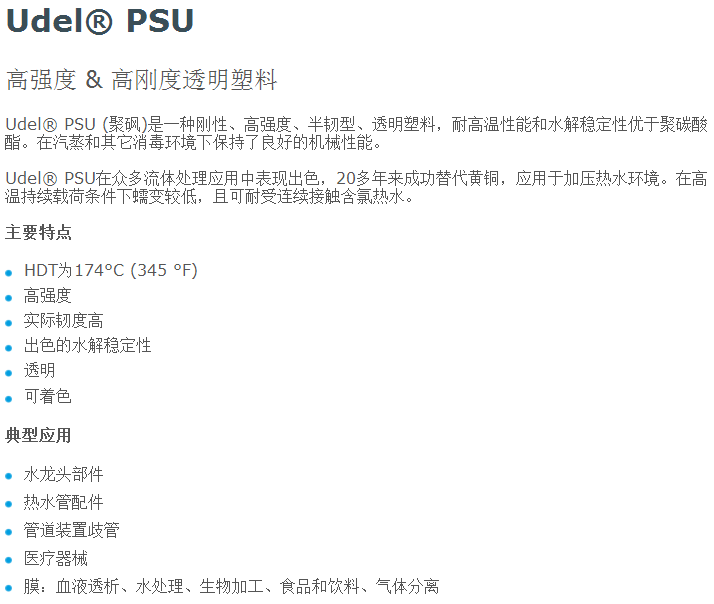 PSU的应用十分广泛,在电子电气领域,PSU可用于制作各种接触器、接插件、变压器绝缘件、可控硅帽、绝缘套管、线圈骨架、接线柱和集电环等电气零件,印刷电路板、轴套、罩、TV系统零件、电容器薄膜、电刷座、碱性蓄电池盒等;在汽车、航空领域,PSU可用于制作防护罩 元件、电动齿轮、蓄电池盖、雷管、电子发火装置元件、灯具部件、飞机内部配件和飞机外部零件、宇航器外部防护罩等。还可用于PSU制作照明器档板、电传动装置、传感器等,世界市场上用来制作机舱部件的聚砜类聚合物需求在继续增长,主要是由于这类聚合物燃烧时释放的热量少、产生的烟雾少,有毒气体扩散量少,完全符合安全规定的使用要求;在厨房用品市场上,PSU可代替玻璃及不锈钢制品用于制造蒸汽餐盘、咖啡盛器、微波烹调器、牛奶及农产品盛器,蛋炊具及挤奶器部件、饮料和食品分配器等产品。PSU为无毒制品,可制成反复与食品接触的用具。PSU作为透明新材料,耐热水、水解稳定性优于其他任何一种热塑性塑料,故可用于制作咖啡壶等。用PSU制作的连接管,用于玻纤或玻纤增强的聚酯砌面,管外层强度高,管内层耐化学品, 较钢管轻,且透明,便于临控,常用于食品工业和制作强光灯的灯盏;在卫生及医疗器械方面, PSU可用于制作外科手术盘、喷雾器、加湿器、接触透镜夹具、流量控制器、器械罩、牙科器械、液体容器、起搏器、呼吸器和实验室器械等。PSU用于制作各种医疗制品较玻璃制品成本低,而且不易破裂,故可用于仪器外壳,齿科仪器,心瓣盒,刀片清理系统,软接触镜片的成型盒,微型过滤器,渗析膜等。PSU还可用于镶牙,其粘接强度比丙烯酸高一倍;在日用品方面,PSU可用于制作加湿器、吹风机、服装汽蒸、照相机盒,放映机元器件等耐热、耐水解产品。经0.4-1.6MGy 辐射和良好干燥过的PSU粒料,在310℃和模温170℃下很容易注塑成型,适用于层压材料的粘合剂,所有带硅烷的聚砜如PSU-SR、PKXR等均可作为粘合剂,用于上浆玻纤和石墨纤维制作复合材料,用石墨织物增强的带硅烷基的PSU,可制作升降舵等飞机部件。PSU在加上固体润滑剂聚四氟乙烯后,可增加耐磨性和物理机械性能,也应用于制备耐磨性涂料;除此之外,PSU还可制造各种化工加工设备(如泵外罩、塔外保护层等)、食品加工设备、污染控制设备、奶制品加工设备及工程、建筑、化工用管道等。